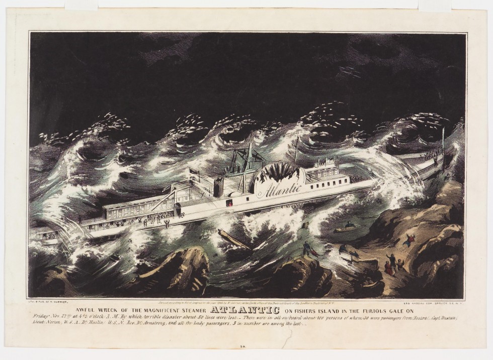 The second horrifying aspect of the loss of the Atlantic was the sheer violence of the crash upon the rocks of Fishers Island, and the mutilation of the passengers who were unable to distance themselves from the wreckage. All women and young children on board, as well as most elderly passengers, gathered in the lady’s cabin as the ship neared the shore of Fishers Island. Surviving passengers recalled that upon first impact, the entire cabin slid off the deck and shattered on the rocks. All those who sought shelter in the lady’s cabin were either killed instantly or crushed by the repeated pounding of the hull of the ship onto the remains of the cabin.