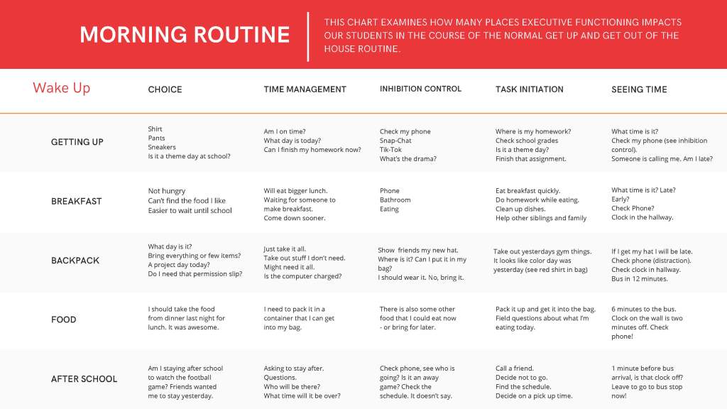 The six competencies of executive functioning are not merely academic, but they are how we make our way through life. That is why it is vital as one of the centers of our support and work in the program. Imagine all the decisions and planning that go into getting out of your home and going to high school.This just gives an example of the twenty-five possible areas that could impact how the day goes and why it goes the way it does. Some of these twenty-five can be supported with help, others fall into specific individual choices.