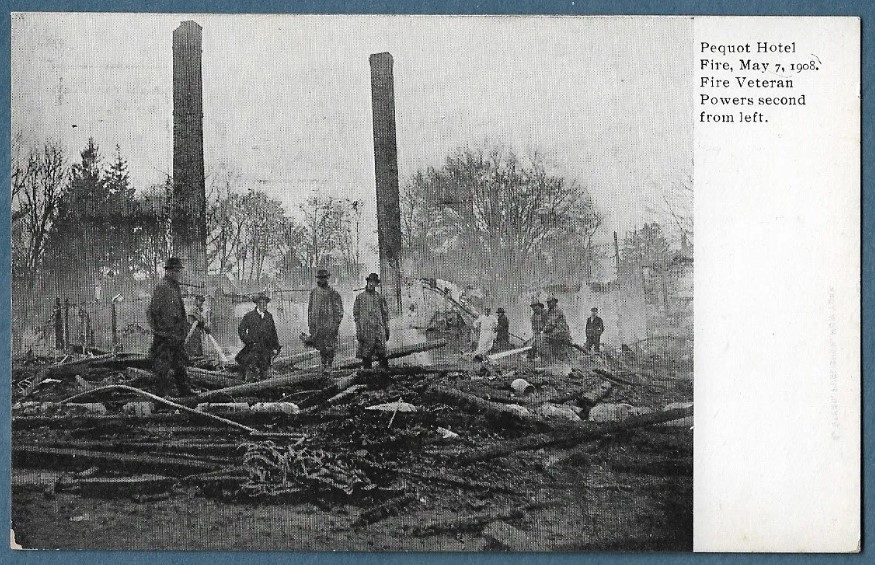 A review of available newspaper archives, particularly articles in the New London Day on the day of and the day following the fire (May 7 and May 8, 1908), reveals the following facts about the crime. On the evening of Wednesday May 6, 1908, prior to the opening of the hotel for the summer season, a caretaker named Richard Greene walked through most of the hotel and noted nothing out of order. Greene was adamant that he did not smoke during his inspection. At approximately 3:10 am on Thursday May 7th, Patrolman Timothy P. Sheehan of the New London Police walked by and looked into the hotel as part of his regular beat. He noted nothing out of the ordinary. At 3:20 am, J. Dempster Sistare, a Groton Constable who was also employed as a watchman at the G.H. Watson residence directly across the harbor from the Pequot House, observed four lights that he first thought were on some vessel in the harbor but ultimately realized they were in the Pequot House. By his estimate, he saw the lights twenty minutes before he heard a fire alarm. At 3:42 am, Officer Sheehan’s regular nightly beat had brought him to a point in front of the Pequot Chapel on Montauk Avenue. At this point, Sheehan reported noticing a heavy smell of smoke in the stiff east to west breeze coming off the harbor. He immediately ran to the Chapel and rang the bell. Hearing this, Charles Harris, the Company Steward of the Pequot Independent Hose Company, rang the bell in the tower of the station at about 3:45 am. In the meantime, Officer Sheehan ran to Glenwood Avenue and pulled the fire alarm at fire box number 54. Sheehan and Mrs. Kirkland, the wife of Pequot Independent Hose Company foreman Eugene Kirkland, ran to the hotel and began removing axes from a shed that they anticipated would be needed to fight the blaze. They were the first to arrive on the scene and did not report seeing others in the area at that time. The fire raged and at one point, thirteen cottages in the vicinity of the hotel were also afire and all efforts were concentrated on saving these other buildings. The Pequot House burned uncontrollably and collapsed completely at 4:10 am. Two adjacent cottages were also destroyed.